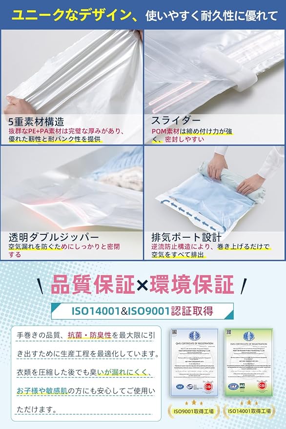 抜群な密封性:抜群なPE+PA素材は完璧な厚みがあり、優れた靭性と耐パンク性を提供します。圧縮袋が防水性と密封性に優れていますので、衣類を湿気やほこりから守って、長時間収納しても無臭です。真空状態でカビとダニの侵入も防ぎます。季節変わり目のふとんの整理には大活躍しています