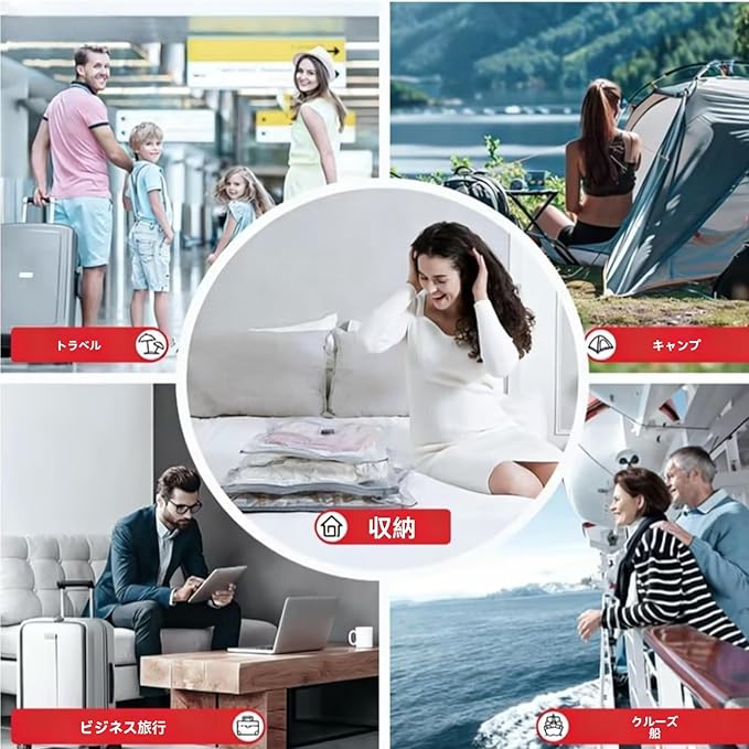 【掃除機不要・簡単4ステップで迅速整理】 ①衣類を入れ、②スライダーでチャックを閉じ、③付属のポンプで吸引し、④キャップを締めるだけのシンプル操作。掃除機を持ち運べない外出先でも、この旅行用圧縮袋なら迅速に荷物を分類・整理できます。修学旅行、引っ越し、キャンプ、海外旅行など、荷物が多くなるあらゆるシーンで活躍する便利な衣類圧縮袋です