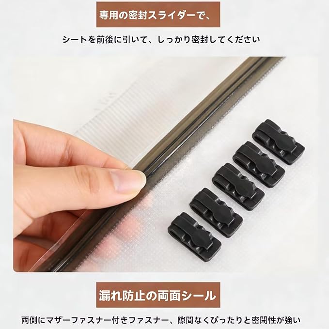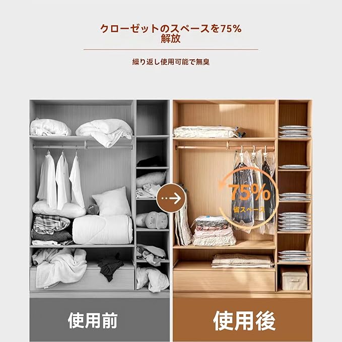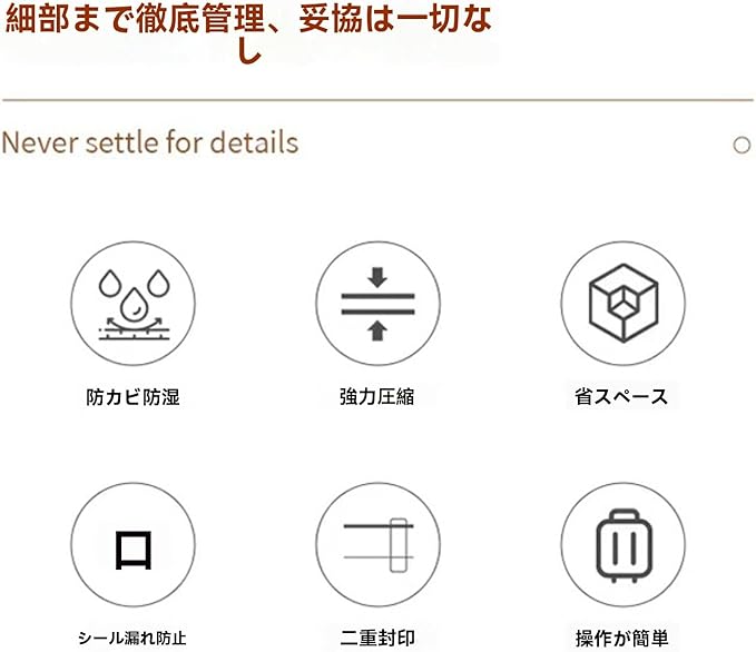 【三重密封構造で空気漏れを徹底ガード】 二重チャックと逆流防止弁による三重構造のターボバルブが、空気の逆流を完全に遮断。防水・防湿・防塵・防臭効果に優れ、最長6ヶ月間、大切な衣類をダニやカビ、湿気から守りながら清潔に保管できます。圧縮袋 旅行時でも長期間の収納でも高い気密性を維持し、ふくらみを抑えてコンパクトな状態をキープします