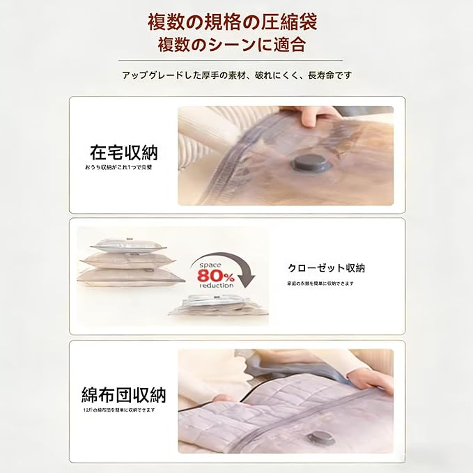 【高耐久・極厚仕様&高品質PA+PE素材採用】 高品質なPA+PE素材を採用し、一般的な製品よりも厚手で丈夫な仕様に仕上げることで、破れにくく繰り返しの再利用が可能です。耐久性に優れた圧縮袋 衣類用として、一度きりの使い捨てではなく、シーズンごとの衣替えや度重なる旅行にも長くご愛用いただけます。中身が一目でわかる透明設計により、必要なものを探す手間も省けます