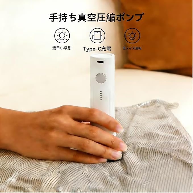 【4000Pa強力吸引&最新型コードレス電動ポンプ】 最新型電動ポンプ「SG-508」は、4000Paの強力な吸引力によりわずか10秒でスピーディーな圧縮を実現。1500mAhのリチウム電池を内蔵したUSB充電式で、重さはわずか120gと超軽量設計。この圧縮袋 ポンプはワンボタン操作とLEDインジケーター搭載で、電源のないアウトドアや海外旅行先でも場所を選ばず手軽に使用可能です