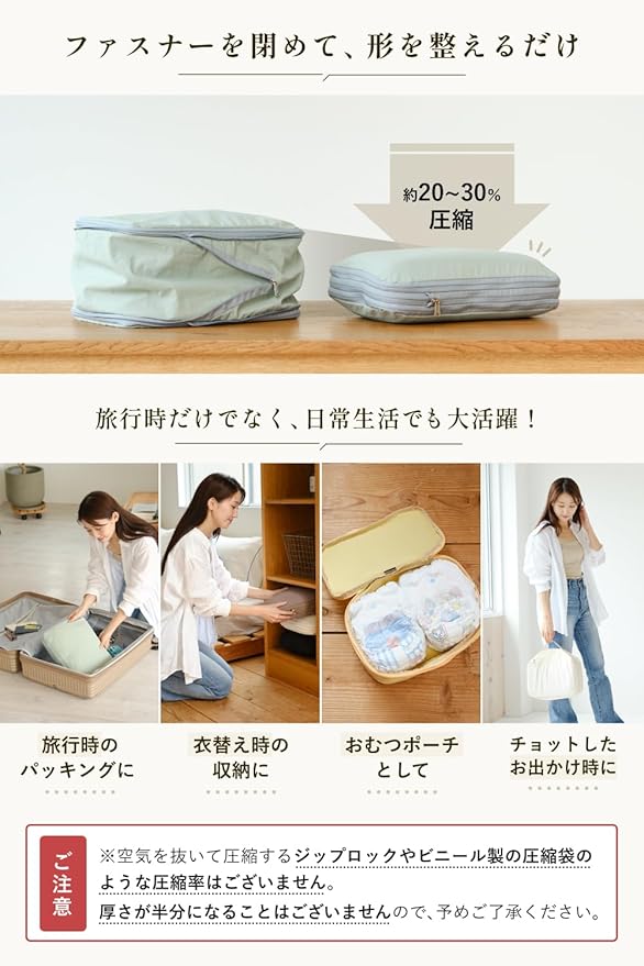 【ファスナーで圧縮、パッキングも楽ちん♪】 圧縮袋と違い、いちいち空気を抜いたりしなくていいので、パッキングも楽ちんです。