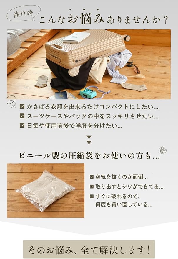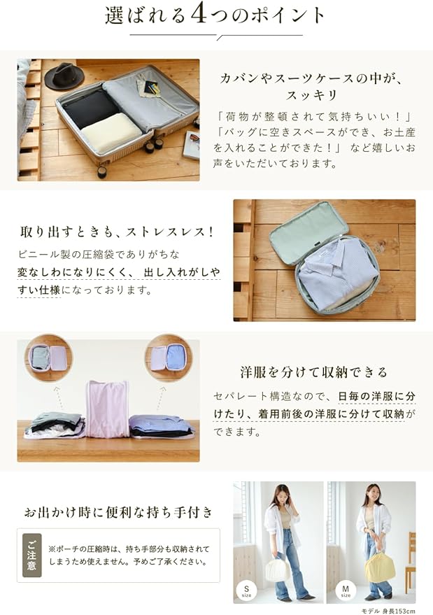【カバンやスーツケースの中がスッキリ!】 衣類が整理されるので、他の荷物も入りやすくなります。「荷物が整理できて気持ちいい」「バッグの空きスペースに、お土産を入れることができた!」など嬉しいお声をいただいております。
