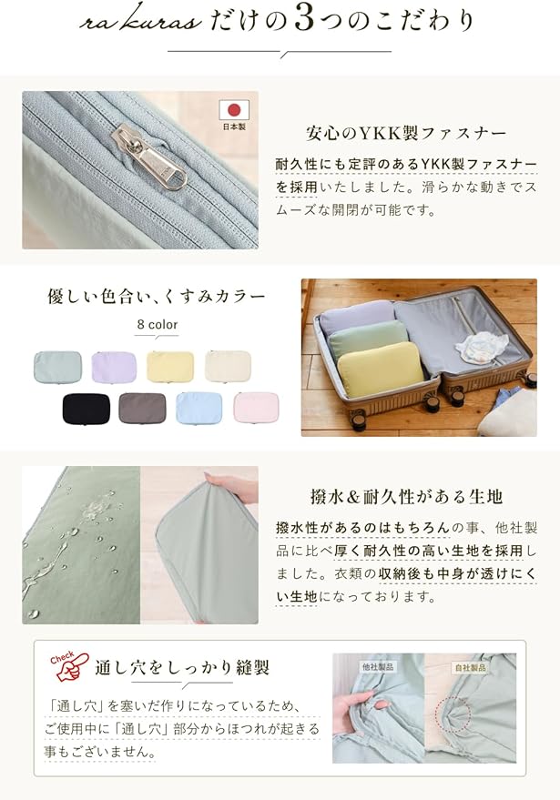 【撥水&耐久性のある生地】 撥水性があり、厚く耐久性の高い生地を採用しました。衣類の収納後も中身が透けにくくなっております。