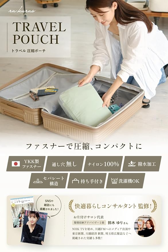 【ナイロン製のポーチだから、長く使える】 ビニール製の圧縮袋とは違い、長くご使用できます。使い捨てではないので、環境にもやさしいポーチです。