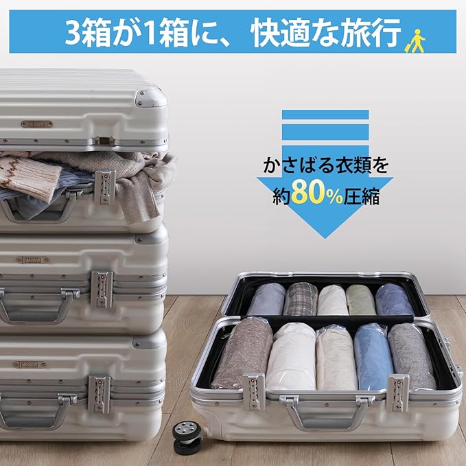 【多彩なシーンで活躍!】トラベルだけでなく、引越しや季節ごとの衣替えなど、さまざまな場面で便利に使えます。シンプルな操作で、貴重な収納スペースを確保します。さらに、優れた防臭性能も備えており、旅行や出張中に着用前と後の服を分けて収納でき、衛生的に持ち運べます。