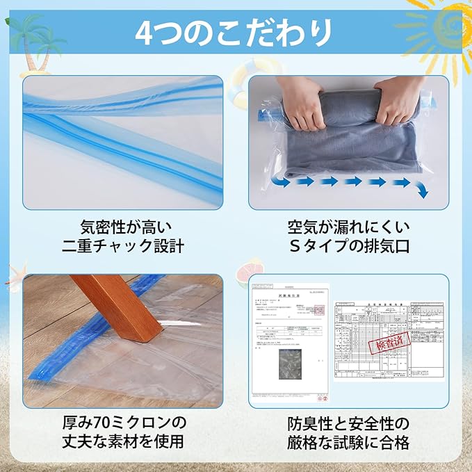 【頼れる衣類保護!高耐久性と優れた密封性】この圧縮袋は、高品質なPA+PE素材を使用し、柔軟性と耐久性を兼ね備えています。従来品よりも1.5倍の厚みで、破れにくく何度も繰り返し利用可能です。さらに、防水性と密封性を確保するため、空気が漏れない二重チャック構造を採用しています。真空状態にすることで衣類を湿気やほこりから守り、カビやダニの侵入を効果的に防ぎ、長期間の収納でも衣類が清潔で新鮮な状態を保ちます。