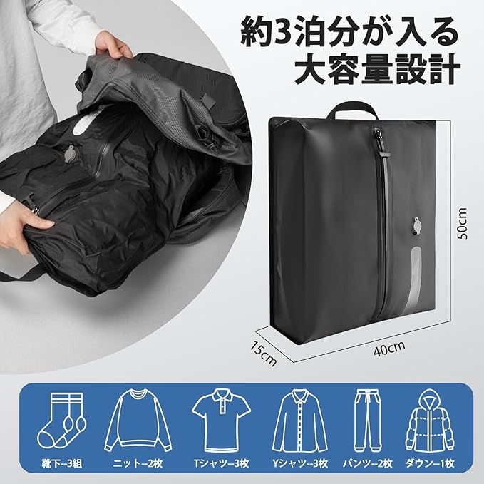 "【こんな人に適】 1. 頻繁に旅行/出張するビジネスパーソン ✓ スーツやシャツのシワ防止に ✓ 短期出張の荷物をコンパクト化 ✓ 移動中の荷物管理を効率化したい方 2. 荷物の多い家族旅行者 ✓ 子供の着替えやオムツなど大量荷物を圧縮 ✓ お土産用スペースを確保したい ✓ ホテルでの衣類管理を簡単に 3. アウトドア/スポーツ愛好者 ✓ 濡れたウェアや靴の衛生管理が必要な方 ✓ キャンプ用具のコンパクト収納に ✓ スキー/スノボの防寒着収納に 4. 美容/ファッションにこだわる方 ✓ 化粧品溢れを防止 ✓ 衣類の型崩れを防ぎたい ✓ 荷開け時の見た目も気にする方 5. 機内持ち込み派の旅行者 ✓ LCC利用で預け荷物を減らしたい ✓ 空港での待ち時間を短縮したい ✓ 移動中の荷物管理が面倒な方 6. 衛生管理に敏感な方 ✓ 濡れ物のニオイが気になる ✓ 洗濯できない衣類を一時保管したい ✓ 共用スペースで周囲に配慮したい方"