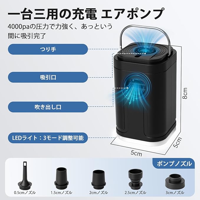 【一台三役エアポンプ】「吸引」「照明」「空気入れ」の3役を1台でこなす充電式ポンプで、プロ級4000Pa強力吸引ができます。ちいさくて140gのサイズで、収納簡単です。5つのノズルもあってあらゆる空気入れと吸引に使えます。