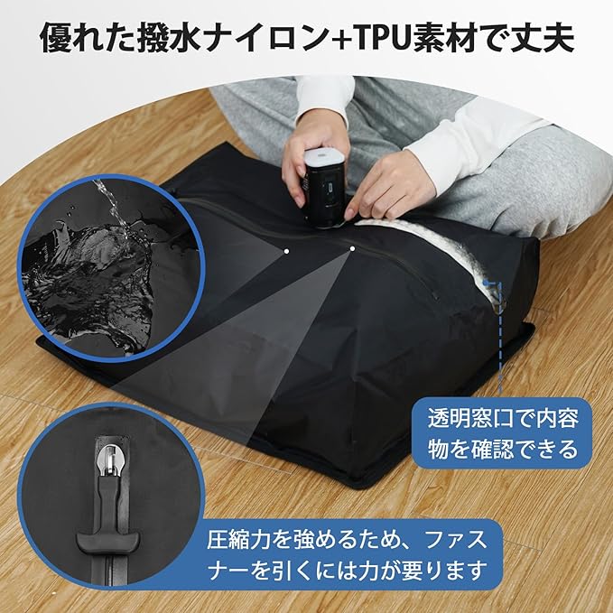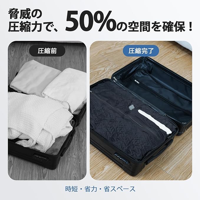 【高圧縮力で約50%スペース節約】この圧縮トラベルバッグはスーツケースやバッグの収納効率UPして荷物のかさばり解消できます。旅行時、ポケットサイズに折って、必要時圧縮した分、空いたスペースにお土産や買い物したものを入れられるので、帰りも安心です。