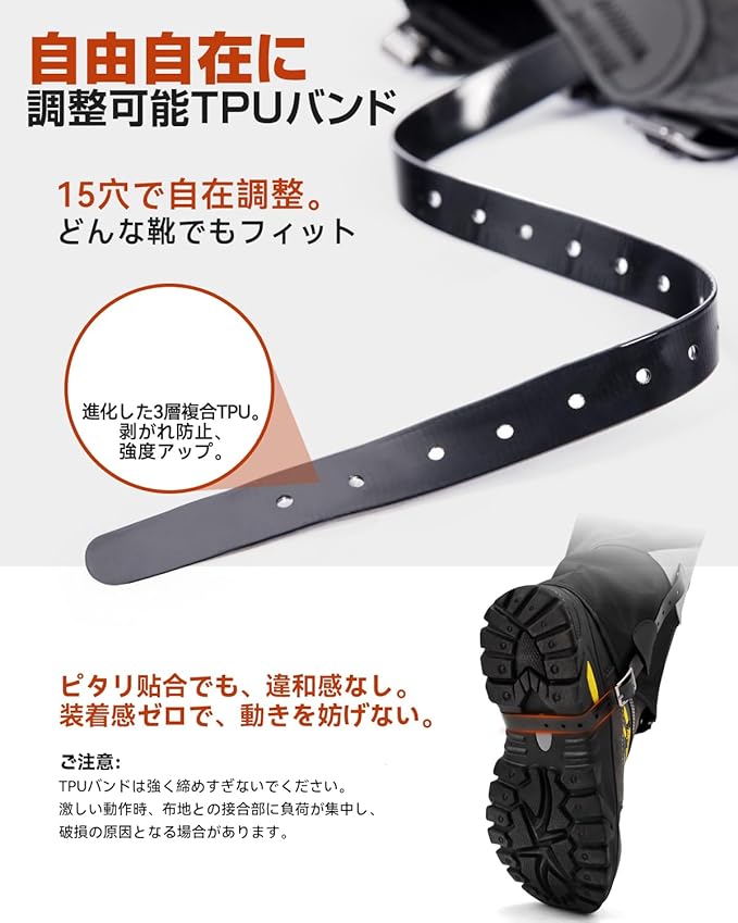 ⭐【体型を選ばないマルチサイズ設計】4サイズで幅広い体型にフィット。TPU調整ベルトは約25cmの長さがあり、厚底ブーツから軽装シューズまでしっかりホールド。側面のファスナー開閉と上部のドローコードで、すき間なくぴったりとフィットします。