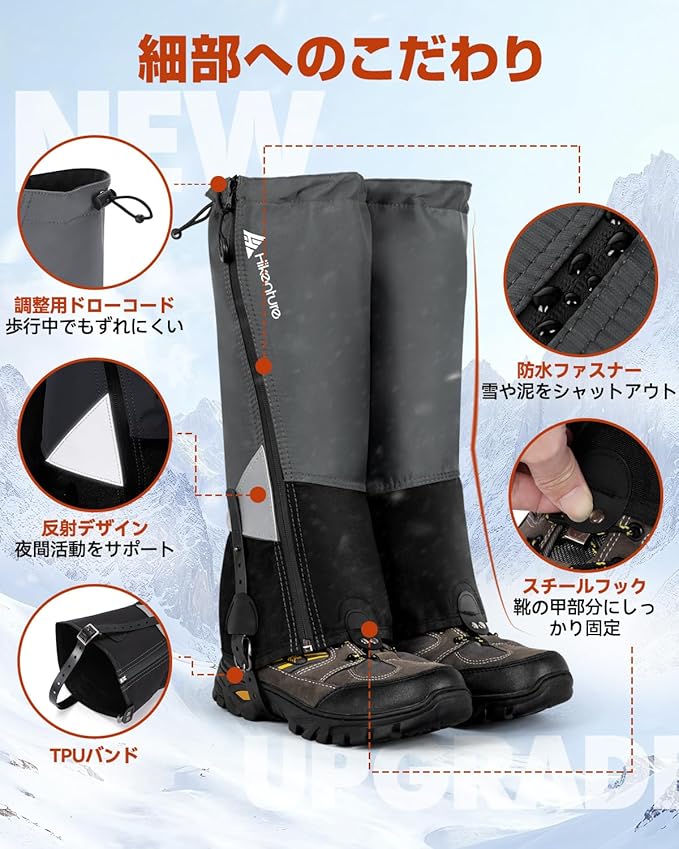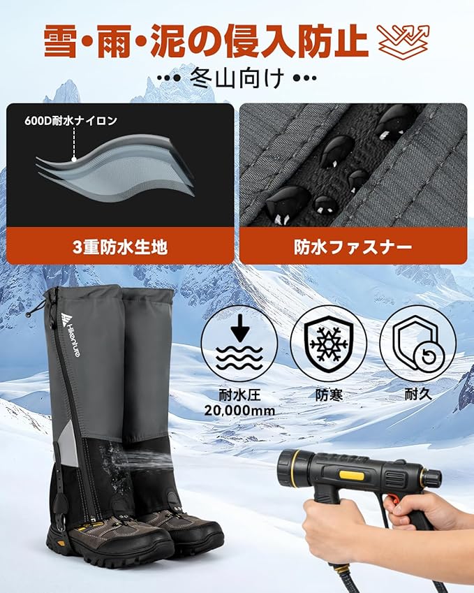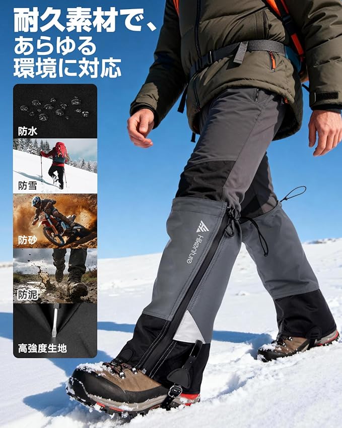 HIKENTURE ゲイター 【防水防風・冬山向け】ロング 登山 高耐久性 レッグカバー 軽量 登山スパッツ トレッキング アウトドア バイク 男女兼用 収納袋付き 泥除け 砂よけ 雨雪悪天候対策