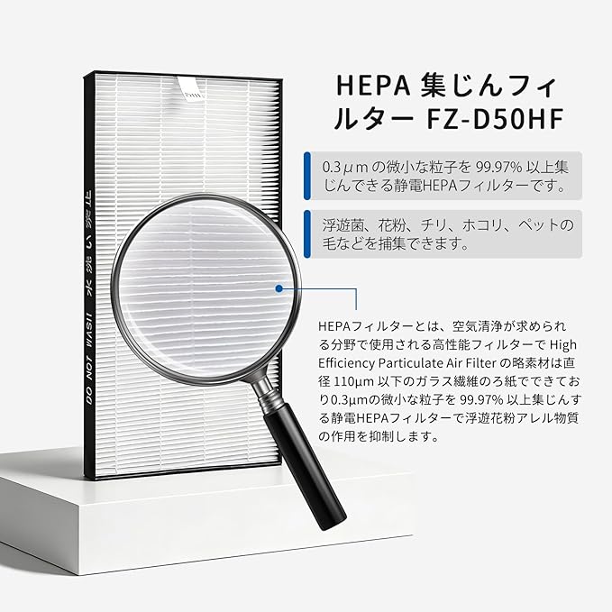 【HEPA集じんフィルターFZ-D50HF】 PM2.5、花粉、アレル物質(ダ二のふん 死がい)、カビ菌、ホコリ チリ、夕バコの煙(粒子)、ペットの毛などを捕集します。お部屋の細かい粉じんやホコリを集めるため変色(灰色、黄土色など)することがありますが、異常ではありません。