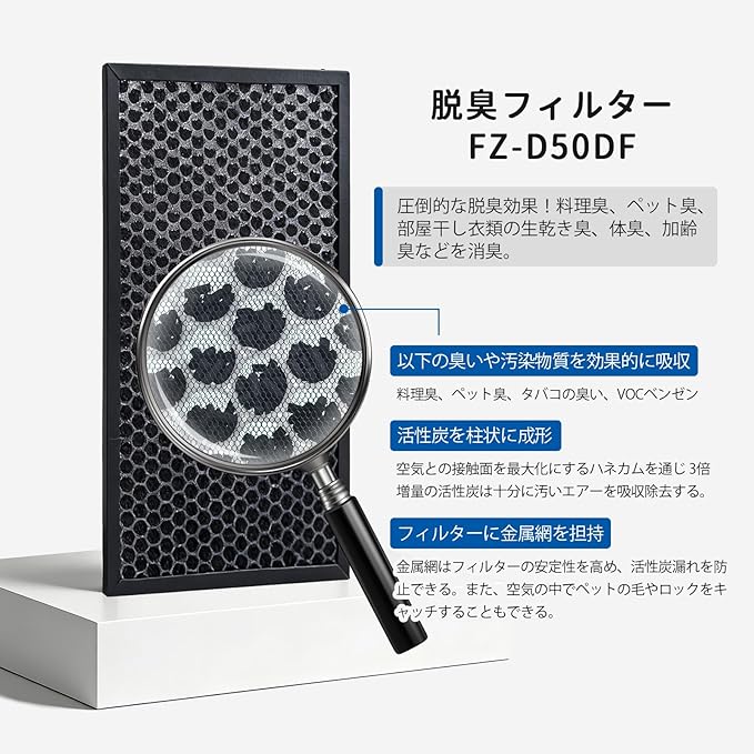【脱臭フィルター FZ-D50DF / FZ-F50DF】脱臭フィルターはニオイの強力分解、脱臭に加え、リビングなどに侵入した排気ガスなどに含まれる有害成分を低減します。料理臭、ペット臭、部屋干し衣類の生乾き臭、体臭、加齢臭などを消臭できます。