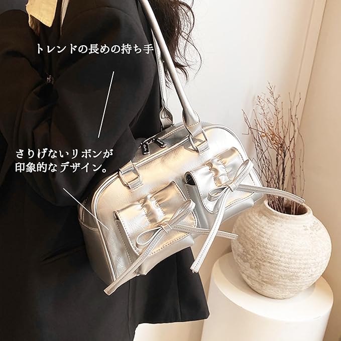 [Lapimou] 横長バッグ リボンバッグ ボストンバッグ ハンドバッグ 肩掛けバッグ ショルダーバッグ バッグ レディース 斜めがけ 横長 リボン 蝶結び シルバー a4 大きめ 大容量 人気 トレンド おしゃれ かわいい パーティ