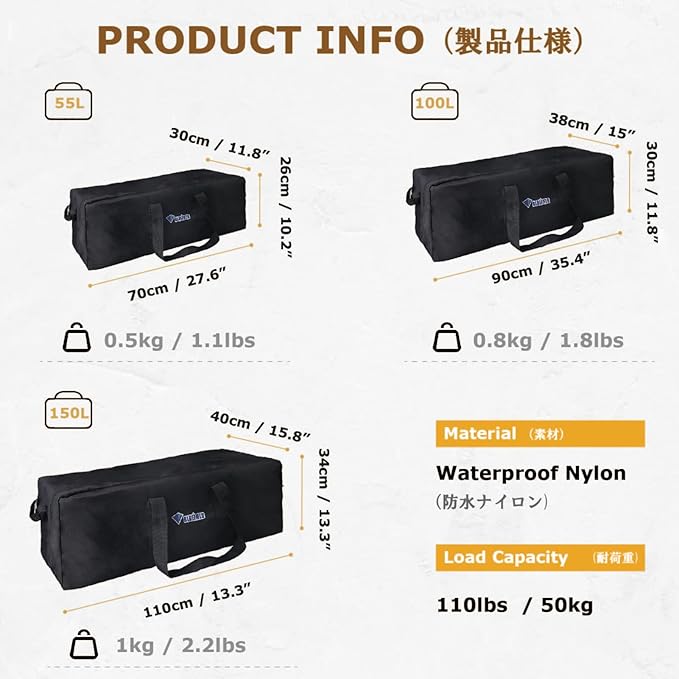 ✅【容量・寸法】- 長 横 縦:55L(70 30 26cm)、100L(90 38 30cm)、150L(110 40 34cm)、耐荷重50kgです、長い大きい荷物は一気に収納できます