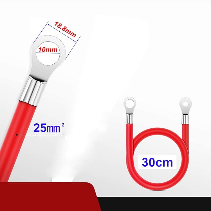 30cmバッテリーインバーターケーブル12V-24V 25mm 3AWG(最大125A)バッテリーケーブル赤と黒の自動バッテリーリード、リング端子付きトラック、オートバイ、ソーラー、RV、マリン用の銅製フレキシブルワイヤー