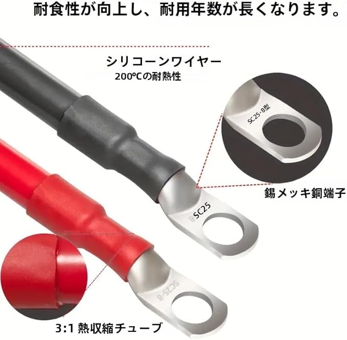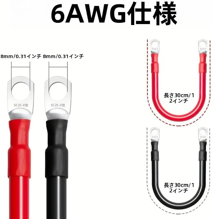 6ゲージ30cmバッテリーケーブルはPVC絶縁で、専門的に切断、圧着、熱収縮され、、防水、防湿、耐腐食、難燃など機能があるため、優れた耐久性を持ちます。錫メッキ端子で、大電流を流しやすく、端子は強化油圧でできており、脱落しにくい。