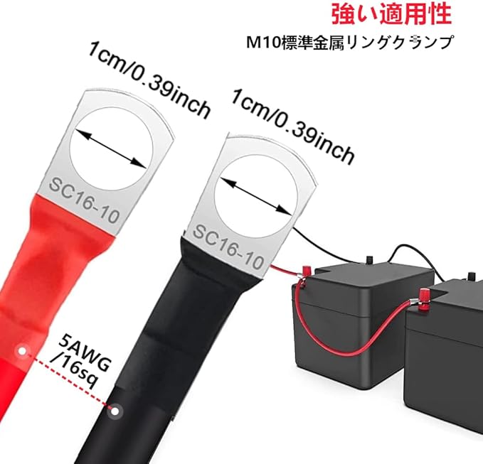50cm 16mm バッテリー増設ケーブルインバーター(最大100A)並列 ケーブル 電気機器用ビニル絶縁電線 KIV線(赤 黒セット) 両側丸型圧着端子 ソーラー、RV、車、ボート、自動車、マリン、オートバイ用の