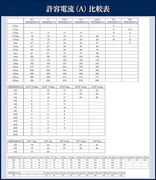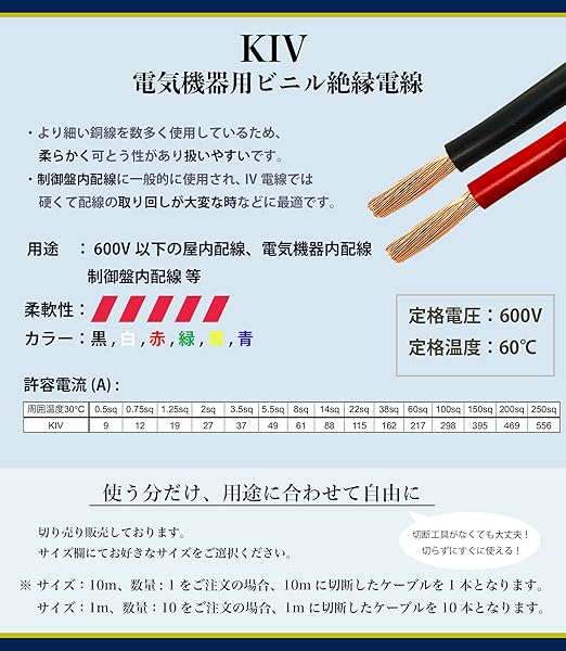 導体に可とうより線 電線:KIV サイズ:3.5SQ 定格電圧:600V 定格温度:60℃ 芯線面積:3.5m㎡ 導体外形:2.5mm 被覆厚:0.8mm 電線外形:4.1mm 許容電流:37A 耐電圧:2000V/1min.