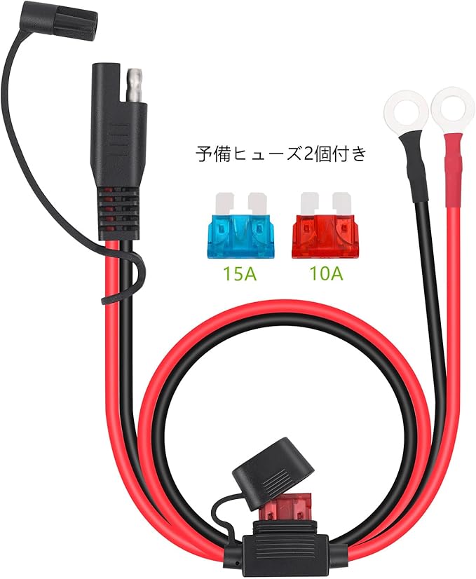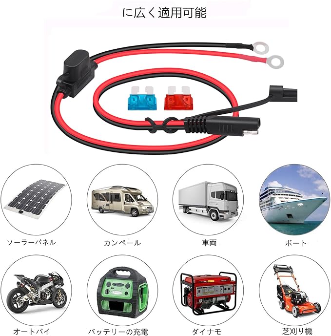 印加電圧:12V-36V ヒューズボックスに内蔵の10Aヒューズ ケーブル仕様:16AWG(1.31平方) 長さ:60cm SAEコネクタにはヒューズ付きの穴あき端子があり、バイク、トラクター、車、ボートなどのバッテリーを充電するためにバッテリーに簡単に固定できます。 SAEコネクタ SAEは 12Vアイレットターミナ。ヒューズへのプラグをすばやく切断します オートバイ、スノ1ーモービル、トラクターなどに適しています