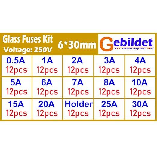 ✪6 * 30mm ガラス管 ヒューズ合計168本入り0.5A/1A/2A/3A/4A/5A/6A/7A/8A/10A/15A/20A/25A/30A各12本+12個のヒューズホルダー