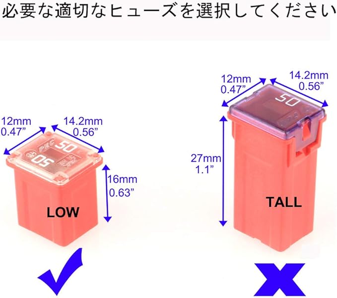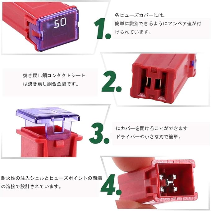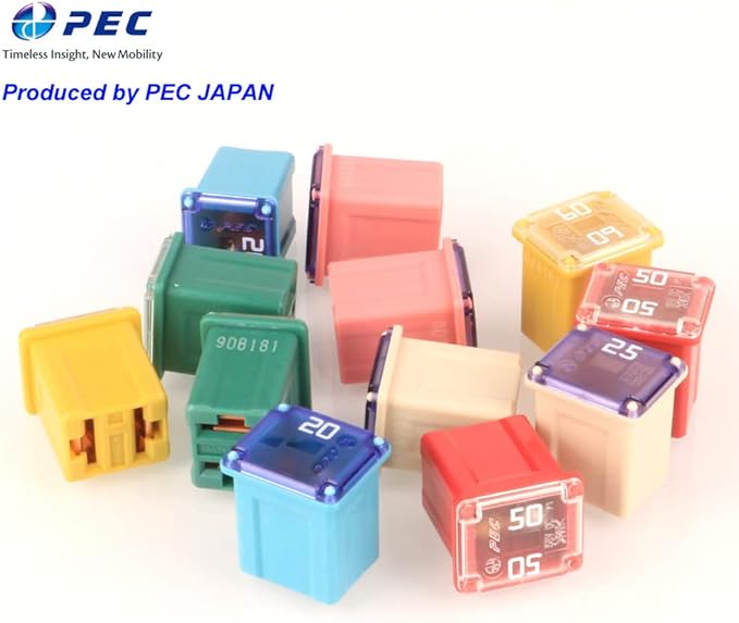 12個のロープロファイルヒューズ、各アンプ定格の6個のヒューズが含まれています:20A/25A/30A/40A/50A/60A。