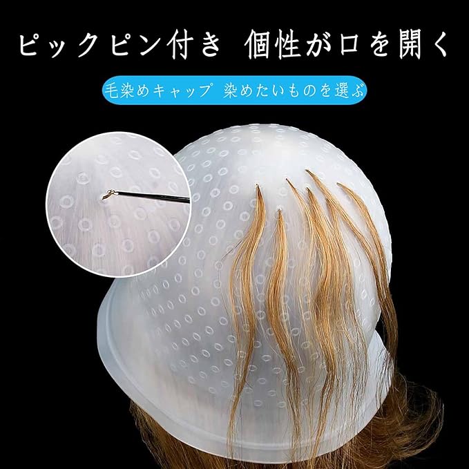 【使い方】①カラーキャップをかぶり、染めたい部分に印をつけて、その部分の穴を開けます。②必要な髪をかぎ針で穴から抜く。③お好みのカラー剤、染料などで染色する。