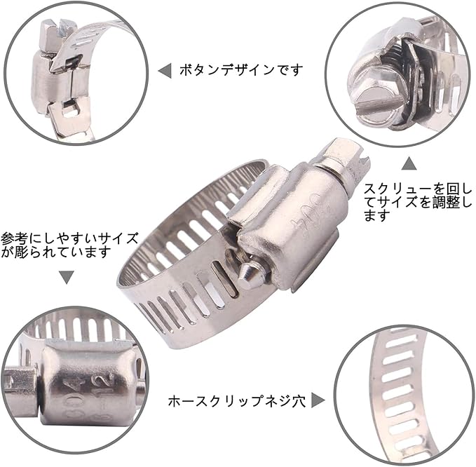 高品質なステンレスバンドで作られたホースバンド:耐久性のあるステンレスバンド(SUS304)を使用しているため、長期間の使用にも耐えることができます。腐食や変形の心配もなく、安心してご使用いただけます。