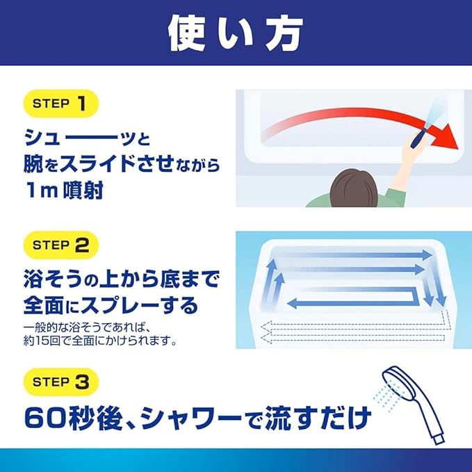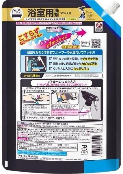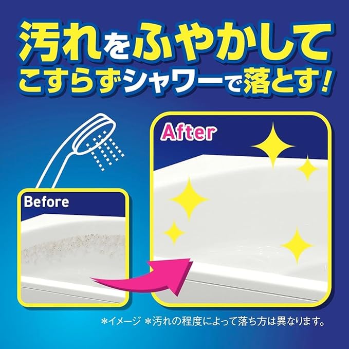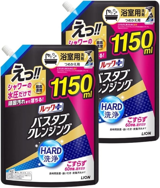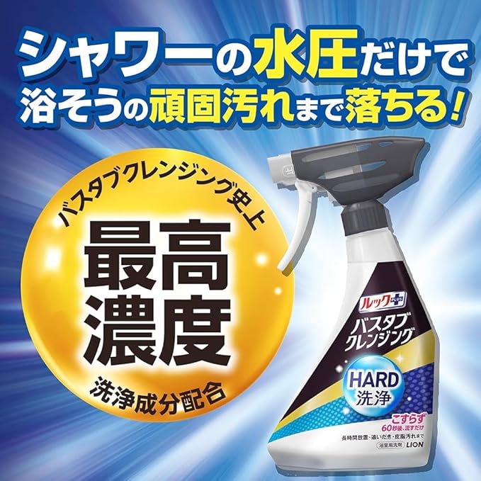スプレーして60秒後にシャワーで流すだけ。こすらず浴槽の汚れを落とせる、時短タイプの浴室用洗剤つめかえ用です。高濃度の洗浄成分を配合し、皮脂汚れ・水アカ・残り湯によるザラつきなど、毎日の入浴で蓄積した頑固な汚れまでしっかり洗浄します。 ミストはムラなく広がり、ワイドに噴射。浴槽全体に洗剤が行き渡るため、こすり洗いの手間を大幅に軽減できます。忙しい日でも短時間でお風呂掃除が完了し、毎日の家事をラクにしたい方に最適です。 浴槽だけでなく、浴室の床・壁・洗面器・イス・鏡などにも使用可能。弱アルカリ性の液体タイプで、すっきりとした洗い上がりを実現します。シトラスの香りで、掃除後も爽やかな空間を保ちます。 大容量1150mlのつめかえ用なので、ストック用やまとめ買いにもおすすめ。専用スプレーボトルに詰め替えてご使用ください。 毎日のお風呂掃除を「こすらない」スタイルに。時短・手軽・しっかり洗浄を叶える浴室クリーナーです。 こすり洗いの負担を減らしたい方、毎日の掃除を効率化したい方におすすめです。