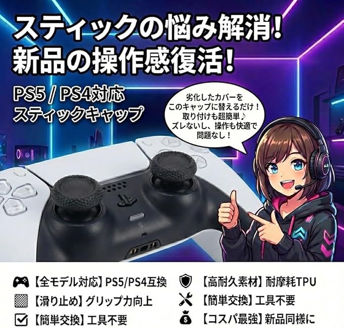 PS5コントローラー スティック キャップ 4個 グリップ 修理 交換 滑り止め加工 快適性アップ 取り付け簡単【スカーレットnet】