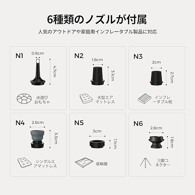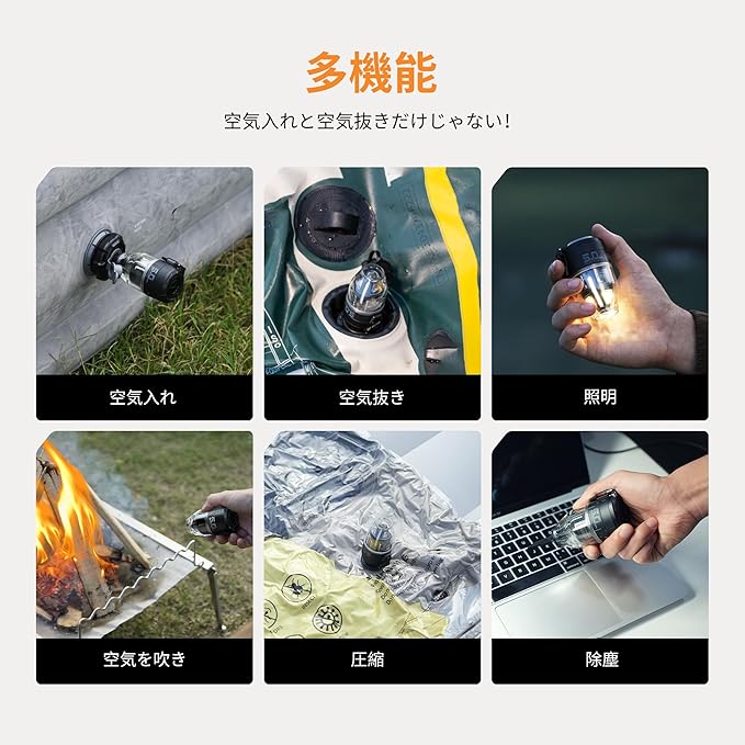 【多用途】6つのエアノズルを搭載、さまざまな場合に対応します。アウトドアのエアクッション、車のエアクッション、水泳リング、水に浮かぶ列、真空保管袋および他の膨脹可能な製品に適しています。