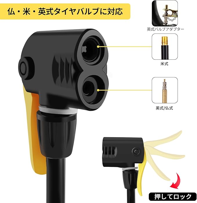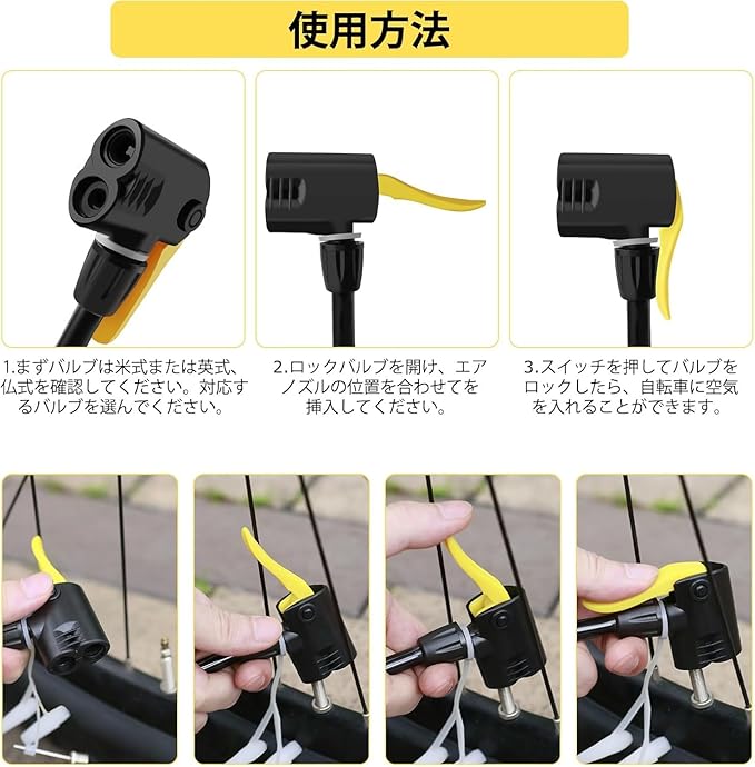 【使用方法】 -まずバルプは米式または英式、仏式を確認して対応するバルプを選んでください。次にロックバルプを開け、エアノズルの位置孝合わせて左挿入してください。最後でスイッチを押してバルプをロックしたら、足踏んで自転車に空気を入れることができます。