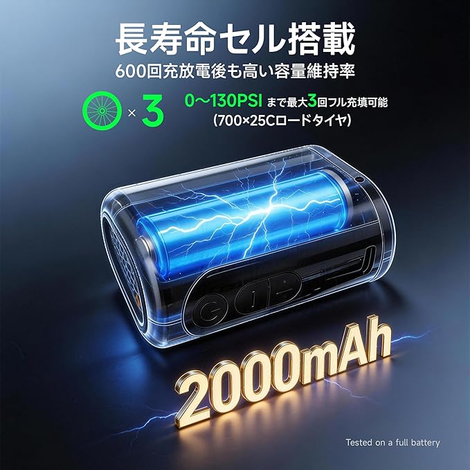 【リアルタイム気圧表示&大容量バッテリー】高精度センサーを内蔵し、現在のタイヤ空気圧をリアルタイムで正確に表示。過充填を防ぎながら、安全かつ効率的に空気充填が可能です。耐久性に優れたバッテリーセルを採用し、約500回の充放電サイクル後も容量の約90%を維持。2000mAhの大容量バッテリーを搭載し、フル充電時には700 25Cタイヤの場合、0PSIから130PSIまで約3本分の充填が可能。ロングライドやツーリングなど、さまざまなライドシーンで安心してご使用いただけます。