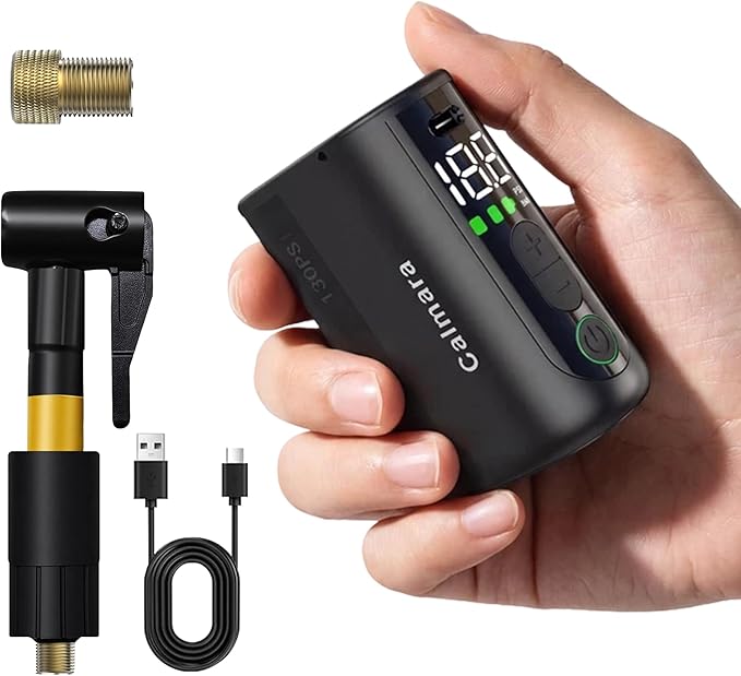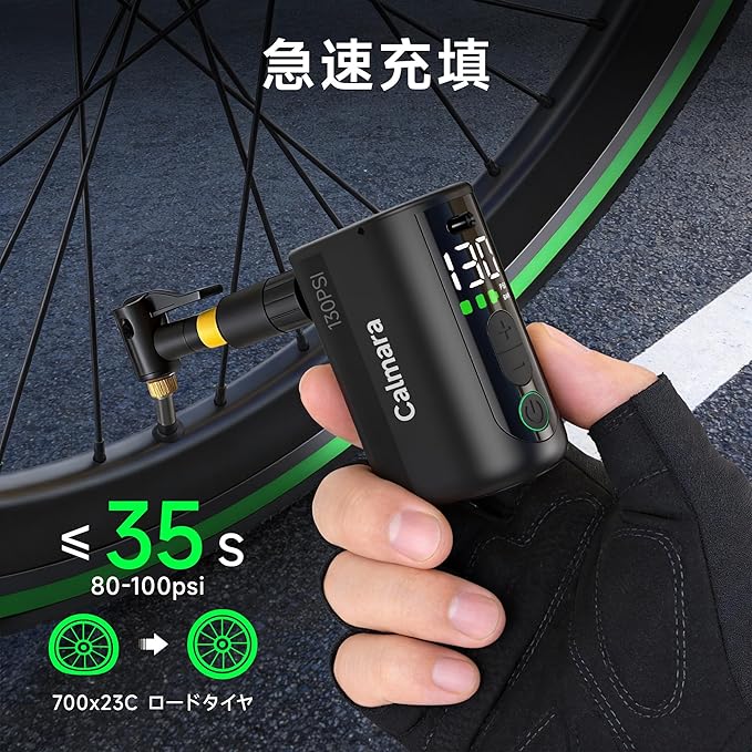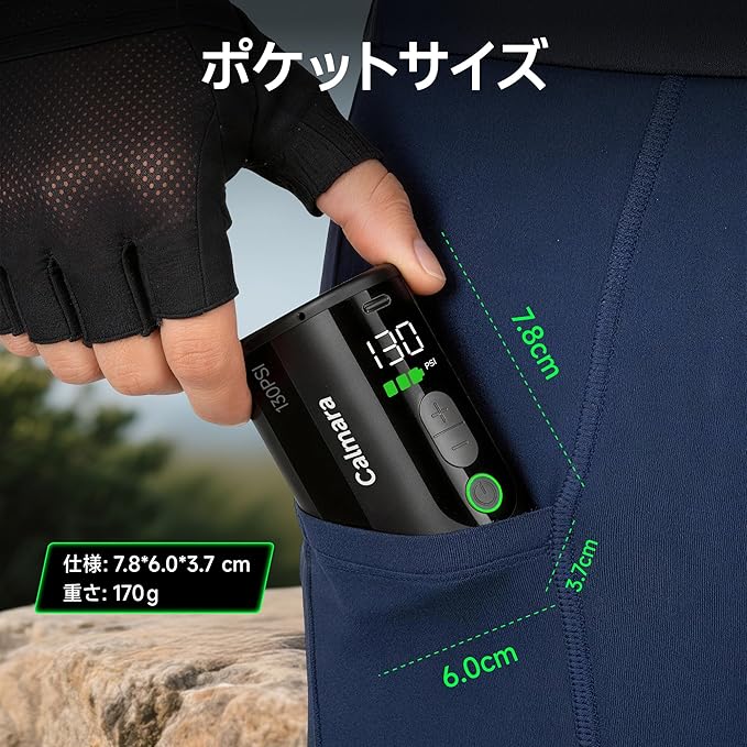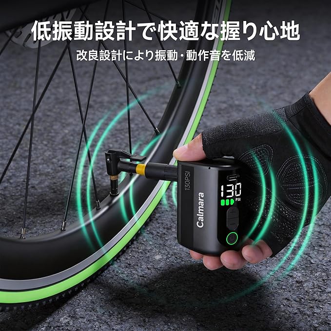 【超コンパクト設計&最大130PSI対応】手のひらサイズのミニ自転車用 電動空気入れ。わずか約170gの軽量設計で、ポケットやサドルバッグにもすっきり収納でき、持ち運びもラクラク。最大130PSIまで対応し、ロードバイクの高圧タイヤにも安心して使用可能です。さらに前回設定した空気圧を自動記憶するメモリー機能を搭載。毎回設定し直す手間がなく、スムーズに空気充填が行えます。