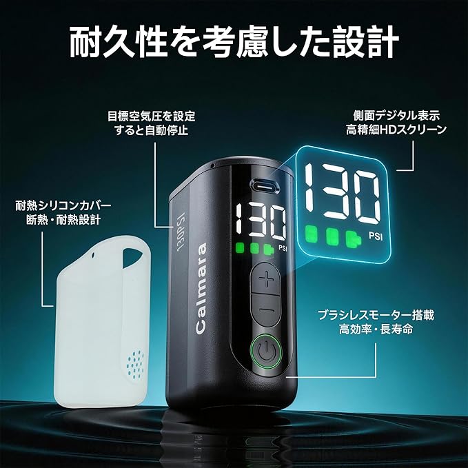【高性能ブラシレスモーター搭載・安定出力】耐久性に優れたブラシレスモーターを採用し、安定したパワフルな空気充填を実現。0PSIから80PSIまで最短約35秒で充填可能。優れた放熱設計により本体の温度上昇を抑え、長時間使用でも安心。製品寿命を大幅に向上させました。
