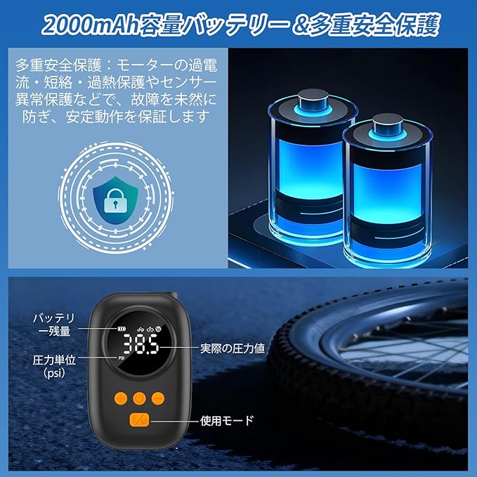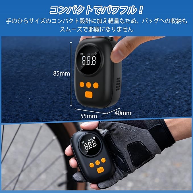 【優れた携帯性でいつでもどこでも使用可能】85 55 40mmという小型でコンパクトな本体は、手のひらにすっぽり収まる大きさ。重量も軽量に設計されているため、カバンや自転車のサドルバッグに入れても邪魔になりません。コードレス設計により、電源のない屋外でも自由に使用可能。通勤中の急なパンクや、アウトドアでのライド中における空気圧低下時にも、この携帯式空気入れがあれば安心です。2000mah大容量バッテリーを搭載し、Type-C充電に対応。フル充電後は複数回の充填が可能で、充電の手間も少ない経済的な設計です。