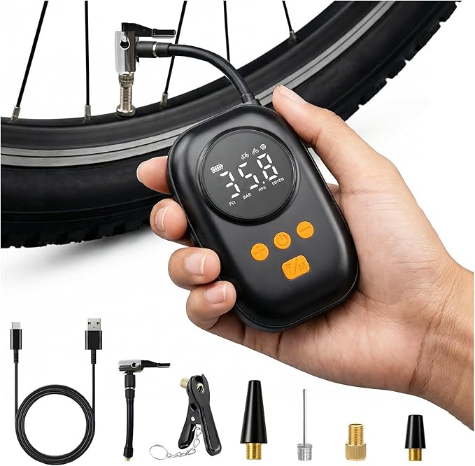 自転車 空気入れ 電動 Oziral超小型 電動ポンプ 最大120PSI 携帯エアポンプ 仏式/米式/英式バルブ対応 LEDライト デジタル気圧表示 自動停止 Type-C充電式 軽量 コンパクト 簡単操作 ロードバイク/MTB/クロスバイク/バイク 日本語説明書付き