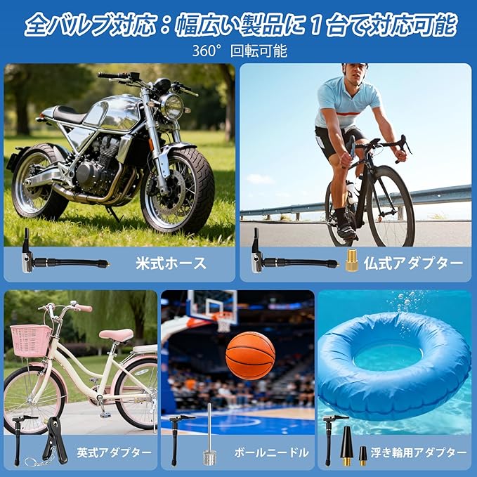 【多様なアイテムに対応する高い汎用性】本製品は電動空気入れとして、最大120PSIまでの高圧充填を実現。米式/仏式/英式バルブ対応のため、日本国内で使用されるほとんどの自転車タイヤにそのまま接続できます。ロードバイクやマウンテンバイク、MTBから日常的な街乗り自転車、子供用自転車まで、幅広い車種のタイヤに対応。さらに付属のボール用ニードルや浮き輪用インターフェースを使用すれば、バスケットボールやサッカーボール、水遊び用浮き輪など、様々なアイテムの空気入れが可能です。この多機能設計により、ご家庭に一台あれば、あらゆるシーンで活用いただけます。