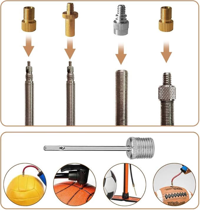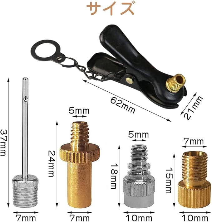 【パッケージ内容】ポンプ口金*1、仏式→米式変換アダプタ*1、米式→英式変換アダプタ*1、仏式→英式変換アダプタ*1、ボール用空気針*1