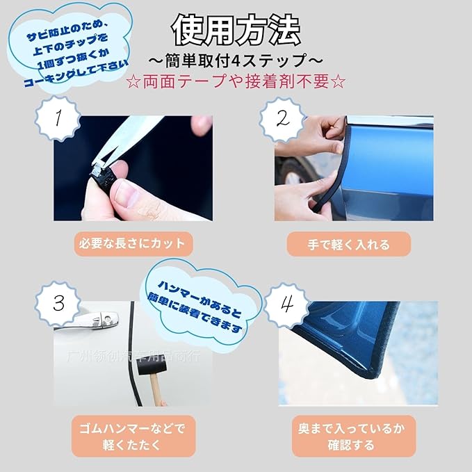 簡単設置&長持ち:ハンマーでドアフレームに簡単に取り付けられ、内側の返しにより一度設置すればしっかり固定。外れにくく、耐久性も抜群です。柔軟性が高く、曲線部分にもスムーズにフィットし、あらゆる車種に対応します。
