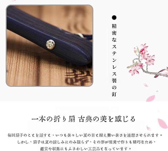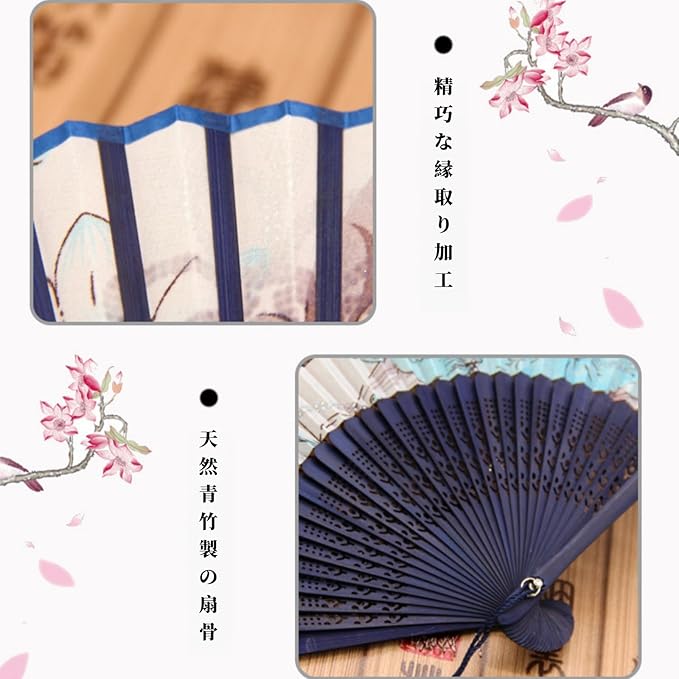 【材質】:扇面にはシルクのような生地(ポリエステル)を使用し、骨部分には、繊細なデザインが切り彫りされた竹を使用した高級感あふれる扇子です。