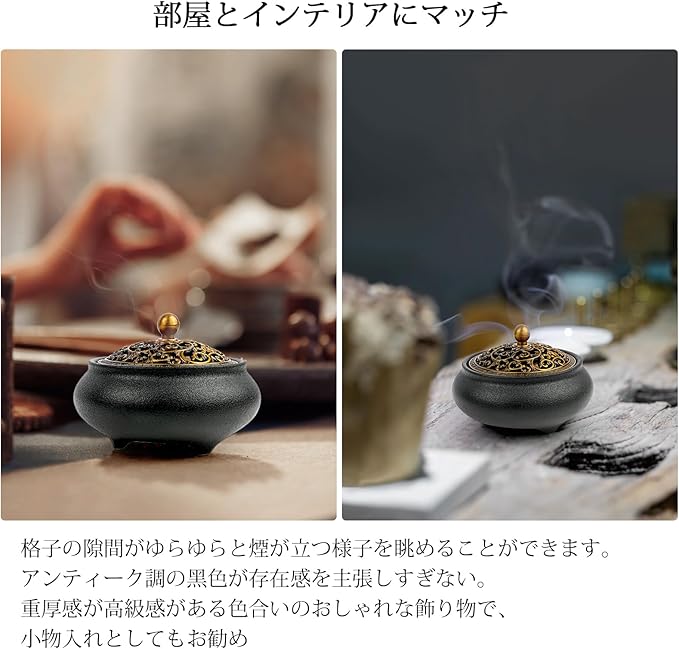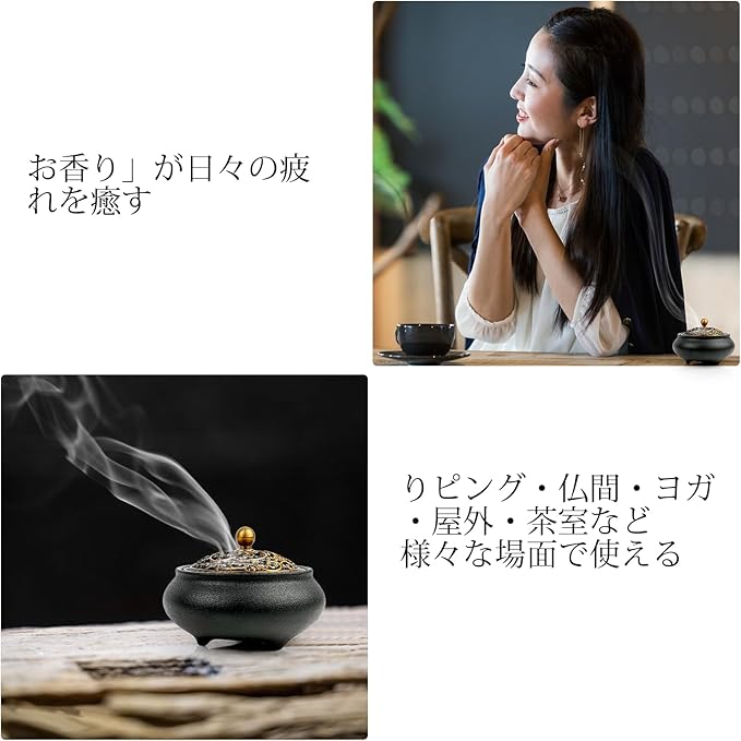★【用途】「香を焚く」ことで、香りでお部屋の消臭や虫除け、運が上がるという風水やお部屋の空気浄化もあると言われています。茶室、瞑想室、図書館、ヨガなどで、然りげ無く香りがする場合に広く使われています。家族、友人また長者への贈り物として最適です。