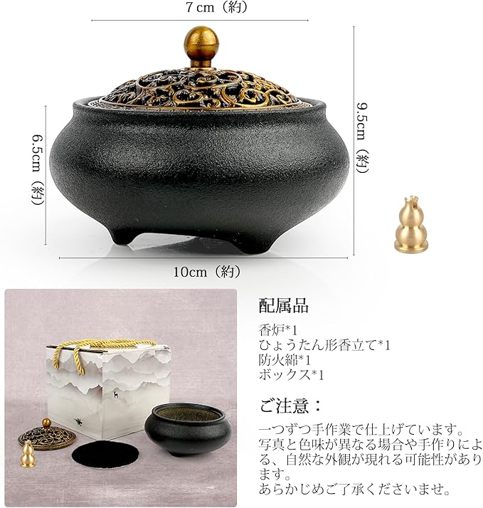 ★【製品仕様】1. 香炉のサイズ(約):高さ7cm、口径7cm、幅10cm 2. ひょうたん型のサイズ(約):高さ2.2cm、幅1.4cm 香立ての穴の直径は3.0mm。 3. 直径3.0mm以下のお線香、直径2.0mm以下プレート径7cmまでの渦巻き線香にお使いいただけます。