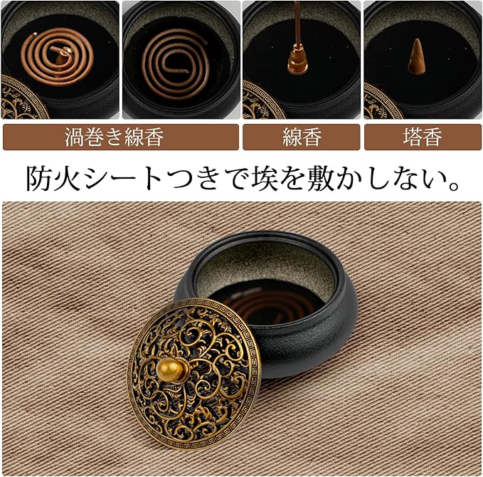 香炉 お香立て 線香立て 陶器 蓋付き 難燃綿と香立てつき ヨガ 瞑想 仏壇用 浄化 香道 仏具