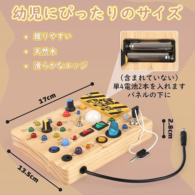 【幼児用モンテッソーリビジーボード】当社のビジー ボードはさまざまな複雑さのスイッチに配置されており、スイッチの照明と一致する電球が含まれています。 この忙しいボードには 10 個の異なるスイッチと 19 個の LED 電球がセットされています。 この感覚ボードは、お子様が何時間もエンターテイメントを楽しむのに役立ちます。 単4電池2本が必要です(電池は付属しません)。