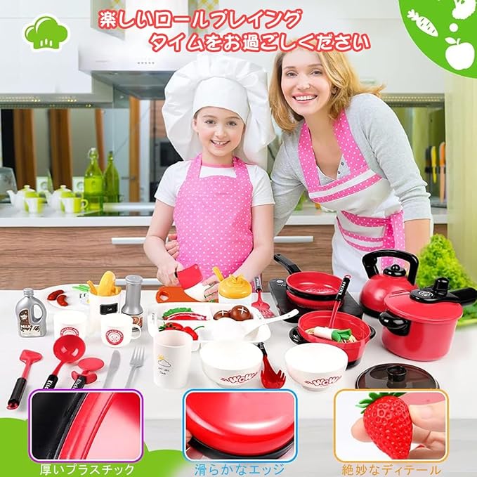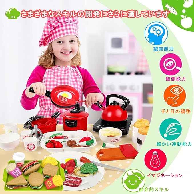 【知育玩具】このキッチンセットは、果物と野菜の種類が多いのですが、子供は遊びながら食材の名前もすぐに覚えられます。また、ごっこ遊びを通じて子供の右脳開発、手眼調和、認識能力、創造力などを向上させるだけでなく、集中力などを高めて、お子様の手先が器用になる能力を鍛えさせます。