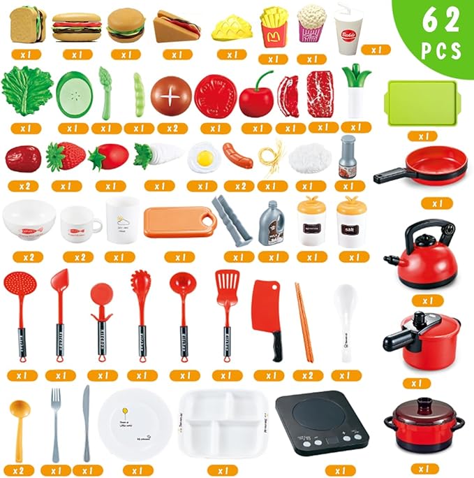 【豪華62点セット内容】食材種類が豊富で、楽しく遊びながら食育を!このセットには電磁調理器、鍋、圧力鍋、スープポット、ケトル、野菜、果物、卵、ソーセージ、米、牛肉、洋食、調味料、ボウル、箸、皿、スプーン、ナイフ、フォーク、キッチン用具などがあります。お子様がお料理をしているように、リアルなデザインで作られています