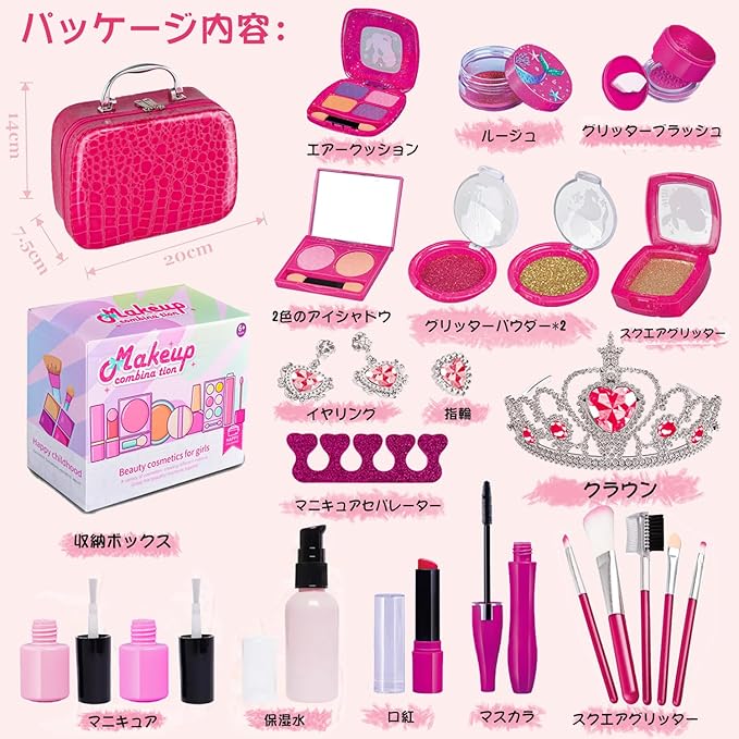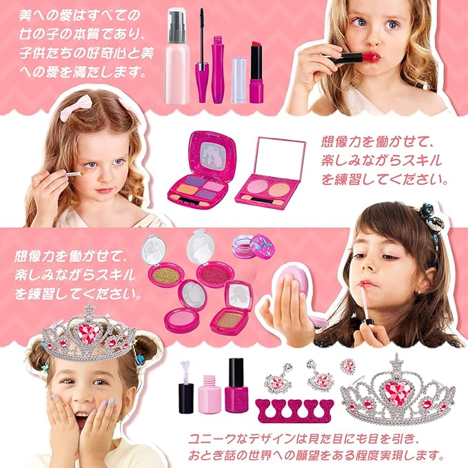 【豊富なメイクおもちゃセット】多くの素敵なブラシ、アイシャドウ、チーク、口紅、つま先セパレーター、マニキュア、プラスチック製のファンデーション、バック、クラウン、指輪、イアリング等が含まれています。女の子の好奇心を満たすことができて化粧セットです。子供の自信、創造力、想像力、センス、ファッション感を育成し、向上させ、楽しみを楽しむことができます。