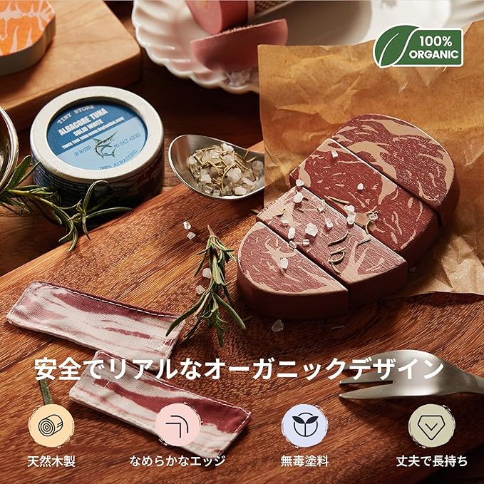 食材 6点入りセット:木製と布製の食材が含まれるセットです 。内容:エビ、ステーキ、ソーセージ、ベーコン、サーモン、ツナ缶の合計6点が含まれています 。